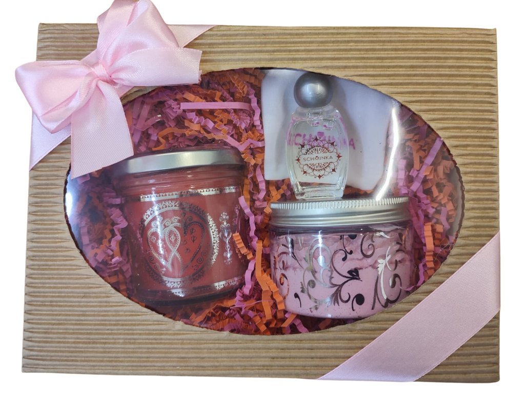 Dárkový balíček „Růžový dotek“ je pečlivě zabalen a ozdoben elegantní saténovou mašlí. Je ideálním dárkem k výročí, narozeninám, Valentýnu, nebo jen jako pozornost z lásky.